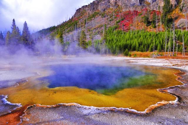 Known as “the most beautiful surface of the earth”, the Grand Prismatic Spring is the largest hot spring in Yellowstone, with a diameter of more than 110 meters, showing different colors such as blue, green, yellow, orange, tangerine and red from the inside out, etc. It is said that after the underground water bubbles up from the cracks of the ground, all kinds of minerals are oxidized by oxidation reaction, and the bacterial habitats in the water at different temperatures with different photosynthesis, which make the water in the spring produce gem-like colorful changes. It is said that after the underground water emerges from the cracks in the ground, various minerals are oxidized and the bacteria in the water at different temperatures and photosynthesized, making the spring water as colorful as gems.
