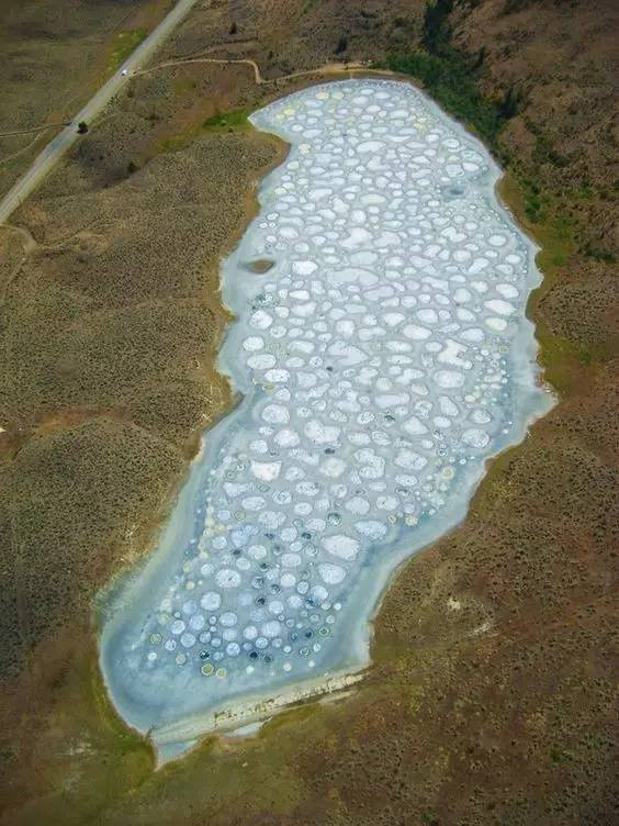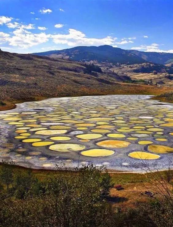 Spotted Lake is a saline lake in northwestern Osoyoos, British Columbia, Canada. As the water evaporates in the summer, it exposes the minerals at the bottom of the lake, creating numerous small puddles shaped like spots.