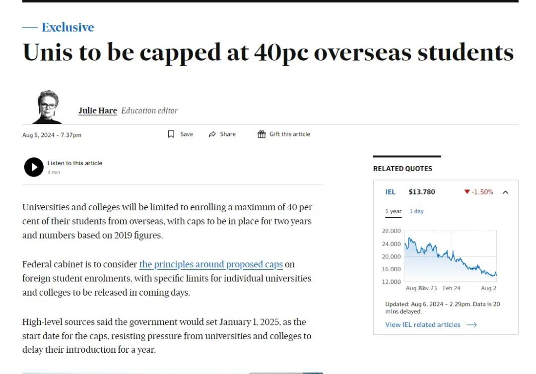 The Australian government has decided to introduce a limit on the number of international students enrolled in Australian universities from January 1, 2025, in order to meet its policy target of keeping the growth of the inward migration population to a strict maximum of 260,000 in the financial year 2024-2025, which will be capped at 40%. At that time, the proportion of overseas students enrolled in major Australian universities will be limited to 40%.