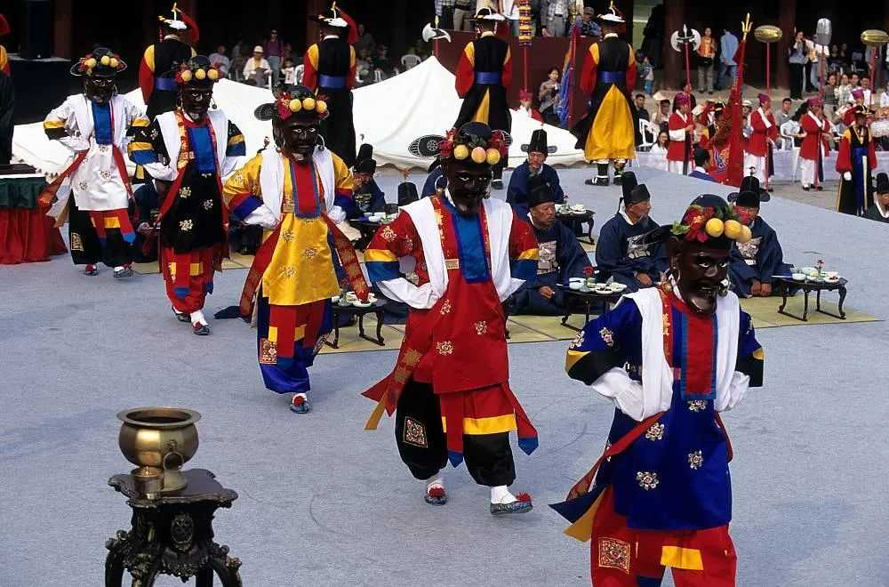 According to Korean legend, the son of the Dragon King Yongwang transformed into a human and saved his human wife through song and dance. The dance is performed by five men dressed in clothes of four colors - white, blue, black, and red, representing the four basic directions and the center. They wear light wine-red masks of human gods, with white teeth, tin earrings, and necklaces of lead beads, and a black hat decorated with two peonies and seven peaches to ward off evil and invite auspicious energy.