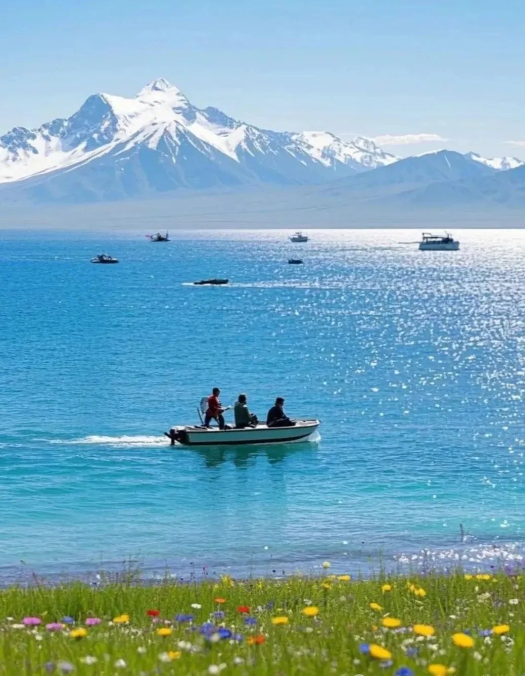The most beautiful lake in the world 💗 Xinjiang - Sayram Lake The blue transparent lake reflects the snowy peaks of the Tianshan Mountains, and the golden grassland extends to the sky. In summer, wildflowers are everywhere, and the air is filled with the sweet scent of flowers. In the evening, the lake shimmers like a layer of gold dust, definitely worth a special visit.
